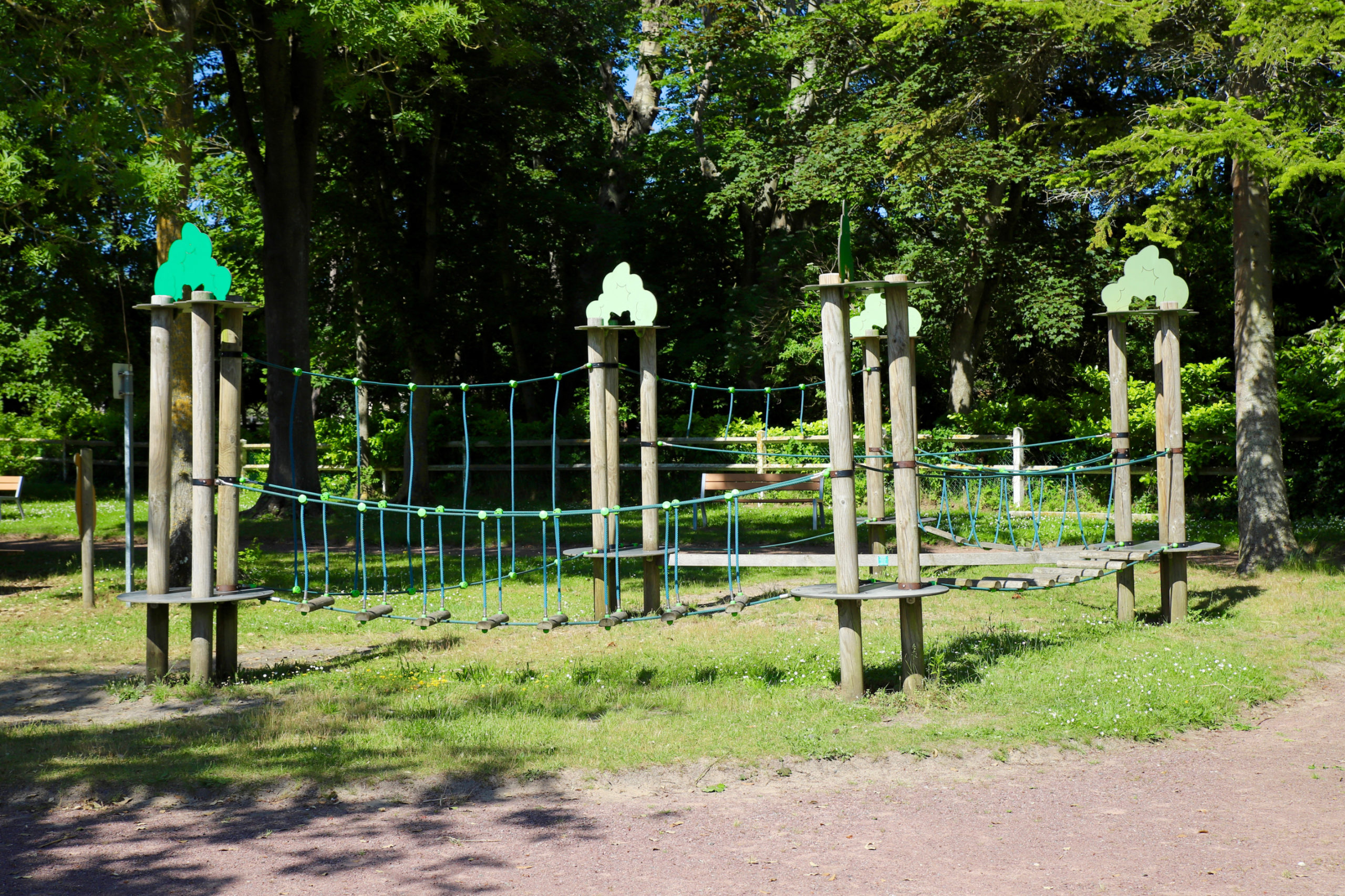 Son aire de jeux offre la possibilité aux enfants de 2 à 6 ans de grimper et de s’aggriper tels des petits singes avec les ponts, poutres et autre « passage des lianes » présents sur le lieu.