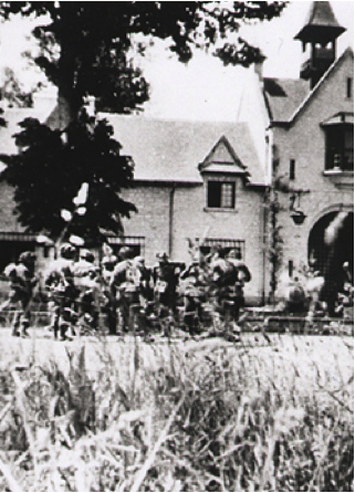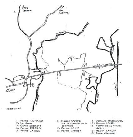 La nuit s’illumine, des centaines de parachutes de la 6é Airborne Division Britanique descendent vers les terres inondées du marais. C’est une erreur tragique, ils devaient tomber à 8 km à l’ouest autour du bois de Bavent. Prisonniers du marais, ils ne peuvent participer au nettoyage de la rive est de l’Orne.192 hommes sur les 750 du bataillon Otway se noient sous le poids de leur équipement et disparaissent dans le marais. Vingt et un sont sauvés par les Varavillais, regroupés dans la cour de la ferme de la vieille rivière ils sont amenés à Robehomme par le chemin de l’anguille par Bernard Lefevre et Violette Bruzeau. De là ils gagneront leur lieu de rendez-vous à Bavent. Vingt et un sont sauvés par les Varavillais, regroupés dans la cour de la ferme de la vieille rivière ils sont amenés à Robehomme par le chemin de l’anguille par Bernard Lefevre et Violette Bruzeau. De là ils gagneront leur lieu de rendez-vous à Bavent.