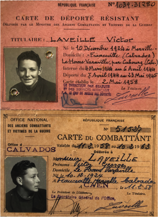 Né à Merville Franceville le 10 décembre 1924, il épouse Janine Gambier le 31/03/1956 à Darnetal. Il décède le 7 juin 2002 à Caen. En 1940, Victor Laveille domicilié au Hôme Varaville est ouvrier agricole. La guerre l’amène à interrompre son apprentissage de chaudronnier au centre de formation de Dives.