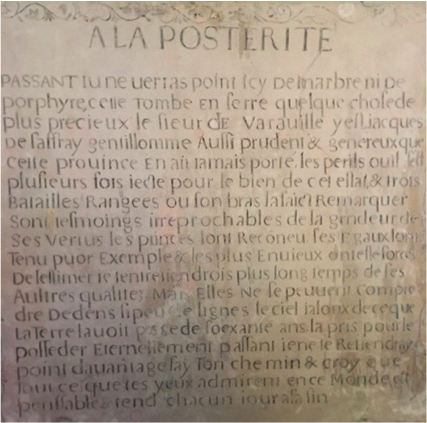 « A la postérité Passant, tu ne verras point ici de marbre ni de porphyre. Cette tombe enserre quelque chose de plus précieux, le Sieur de Varaville y est. Jacques de Saffray gentilhomme aussi prudent et généreux que cette province en ait jamais porté. Les périls où il s’est plusieurs fois jeté pour le bien de cet état et trois batailles rangées sont les témoins irréprochables de la grandeur de ses vertus. Les princes l’ont reconnu, ses égaux l’ont tenu pour exemple et les plus envieux on été forcés de l’admirer. J’entretiendrai plus longtemps de ses autres qualités mais elles ne se peuvent comprendre en si peu de lignes. Passant, je ne te retiendrai point davantage, fais ton chemin, et crois que tout ce que tes yeux admirent en ce monde est périssable et tend chaque jour à sa fin »