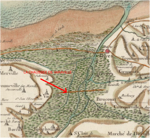 Aux environs de 900 av JC (début de l’Age de fer) puis vers 550 av JC, les premiers habitants, des celtes sont venus des iles britanniques par la mer. D’après César, vers -51 av JC, Caius Fabius, à la tête de 26 cohortes de légionnaires, soumet les gaulois peuplant la « Normandie ». Désirant créer des voies rapides de communication pour les troupes et les liaisons administratives, les légionnaires romains au IIIéme siècle créent pour éviter le passage à gué une route droite et surélevée permettant de franchir le marais, entre Varaville et la croix Kerpin. Longue de 4 kilomètres, elle offre l’aspect d’une haute digue de pierre, oû vient buter la mer à marée haute, reliée aux ponts de la Divette et de la Dives. Jusqu’alors, on ne franchit cet espace que très en amont, à hauteur de Frénouville. Désormais, la Dives devient franchissable en aval du port de Dives-sur-Mer, où un autre passage, dû peut-être lui aussi aux Romains, existe certainement au haut Moyen Âge. Elle se poursuit jusque Dives et le bas Cabourg par un chemin de terre qui s’empierre progressivement.