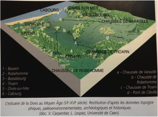 En aval de la chaussée de Varaville, l’estuaire forme une vaste lagune protégée de la mer par un cordon de dunes. Pendant 8 siècles, la mer, à chaque marée, s’y engouffrera et viendra jusqu’au pied de la chaussée qui l’empêchera de remonter dans les terres. Petit à petit les alluvions se déposeront, le niveau augmentera et les terres s’assècheront. Du haut de ses 33 mètres, Robehomme est une ile où l’on accède par bateau à marée haute. Les habitants de Varaville cultivent les terres situées de l’autre côté, au sud. Au nord s’étendent les grèves et les petites îles, ou « hogues », sur lesquelles ils produisent du sel au printemps et mènent leurs troupeaux de moutons. Le village, doté d’une église dédiée à saint-Germain, se développe au cours du haut Moyen Âge, non loin de la petite agglomération portuaire de Dives-sur-Mer.