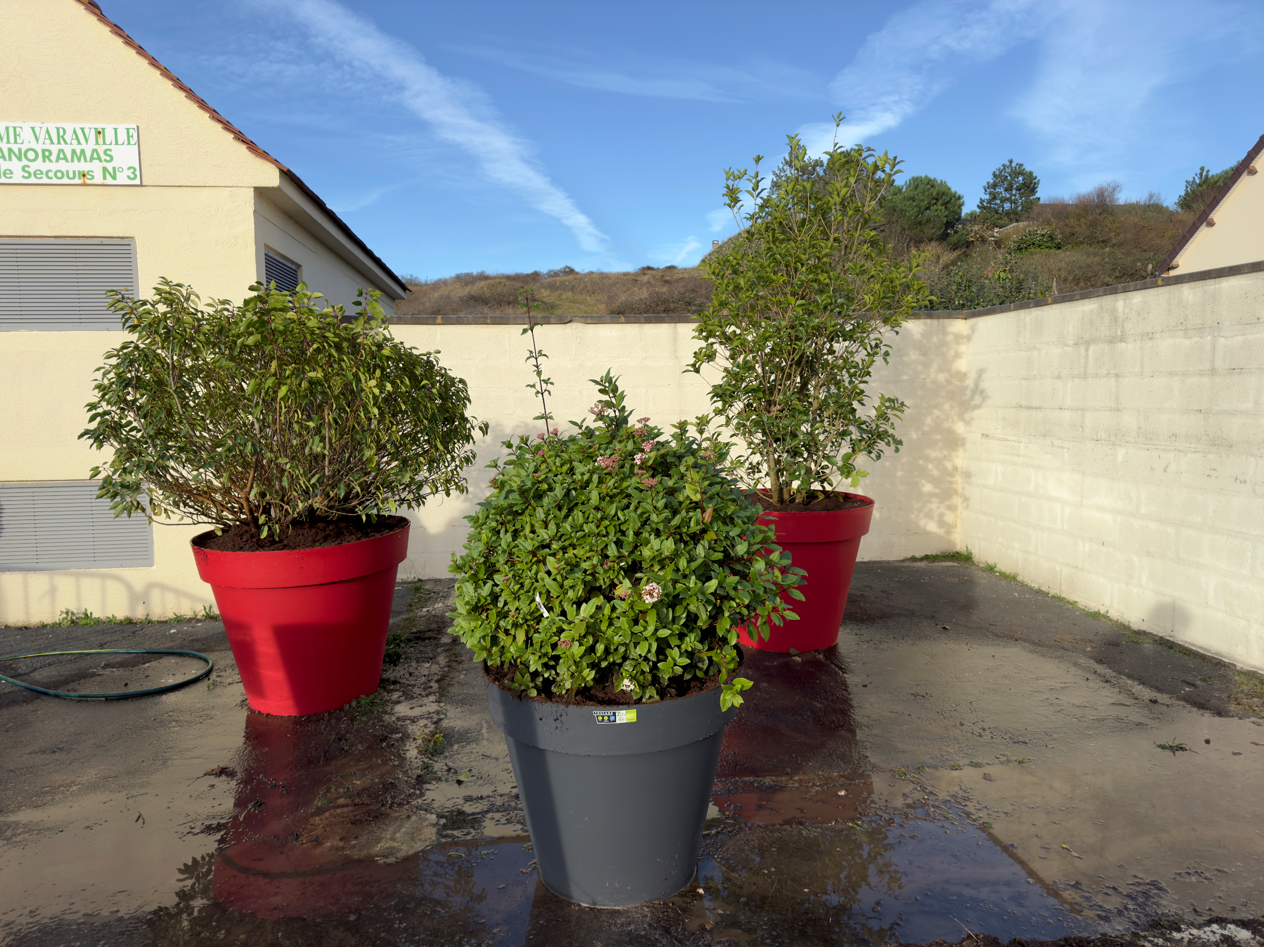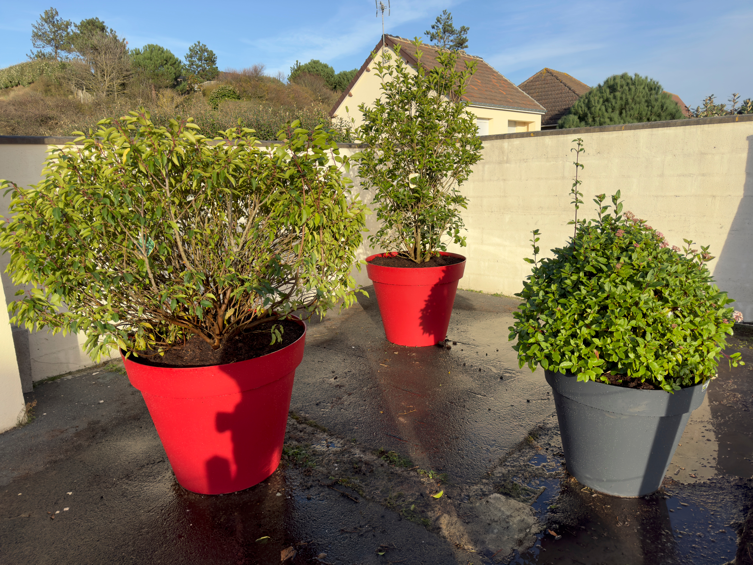 Désormais trois arbustes, un Viburnum Tinus Eve Price, un Prunus Lusitanica Angustifolia et un Osmanthus Aquifolium habillent désormais cet espace.