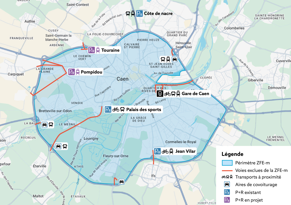 Le périmètre de la ZFE-m correspond à l’intérieur du périphérique de Caen et couvre onze communes (Bretteville-sur-Odon, Caen, Carpiquet, Cormelles-le-Royal, Éterville, Fleury-sur-Orne, Hérouville-Saint-Clair, Ifs, Louvigny, Mondeville, Saint-Germain-la-Blanche-Herbe). Cependant, c’est l’ensemble des 48 communes de l’agglomération qui est impacté car c’est le fait de traverser cette zone qui est pris en compte pour la circulation.